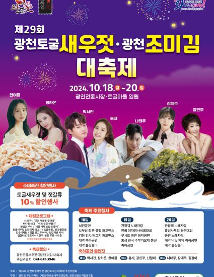 정동규 광천읍장은 “광천의 대표 특산품인 광천토굴새우젓과 광천조미김을 활용한 이번 축제가 관광객과 지역주민 모두에게 특별한 추억이 되길 바란다”라며“올해는 더욱 풍성한 프로그램과 다채로운 부대행사로 많은 관광객들을 맞이할 준비가 되어있어 더욱 기대된다”고 밝혔다.