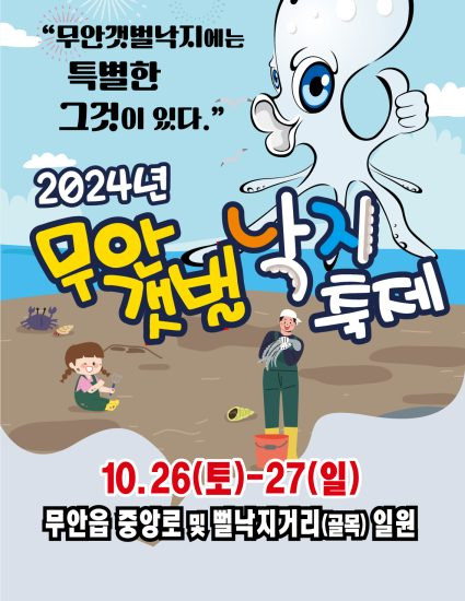 전남 무안군(군수 김산)은 10월 26일(토), 27일(일) 이틀간 ‘2024 무안갯벌낙지축제’를 무안읍 뻘낙지거리 및 중앙로 일원에서 개최한다.