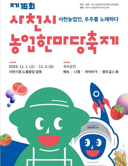 사천시의 대표적인 가을축제인 제16회 사천시농업한마당축제가 오는 11월 1일부터 11월 3일까지 3일간 사천시청 노을광장 일원에서 개최된다.