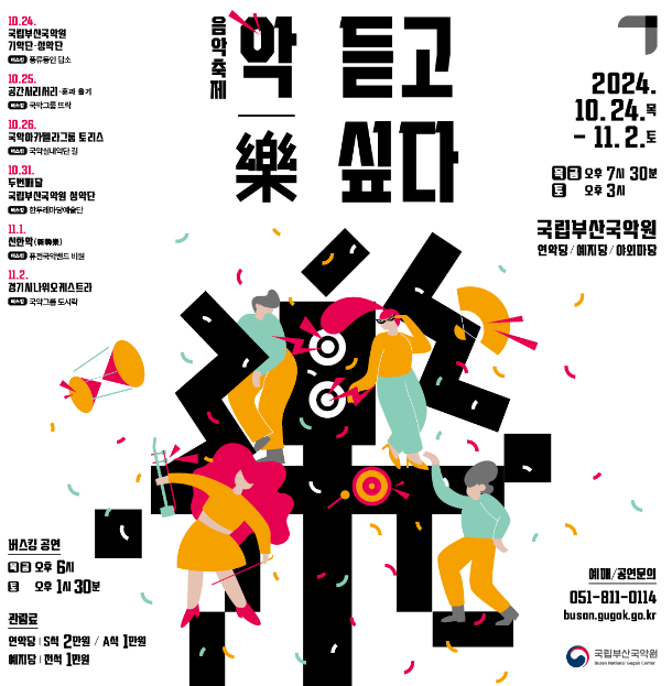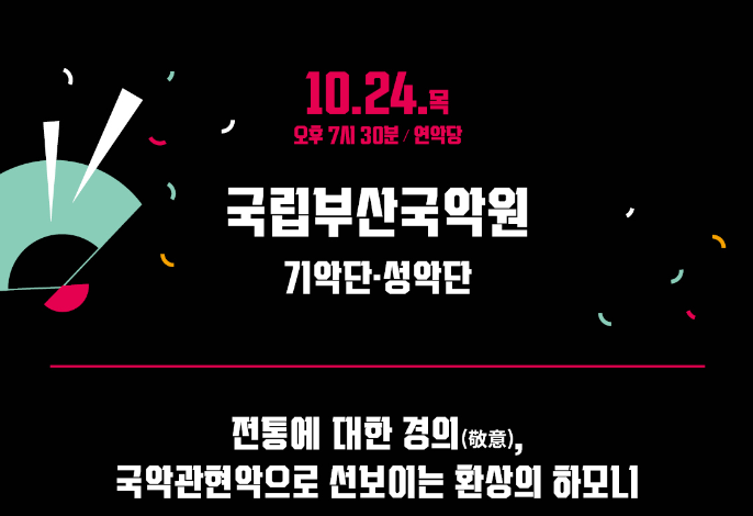 국립부산국악원(원장 이정엽)은10월 24일부터 11월 2일까지 음악축제 <樂, 듣고싶다>를 개최한다. 올해 첫 선을 보이는 음악축제는국내 유수의 예술 단체를 초청해 선보이는 공연으로 다양한 장르의 음악을 즐길 수 있다.