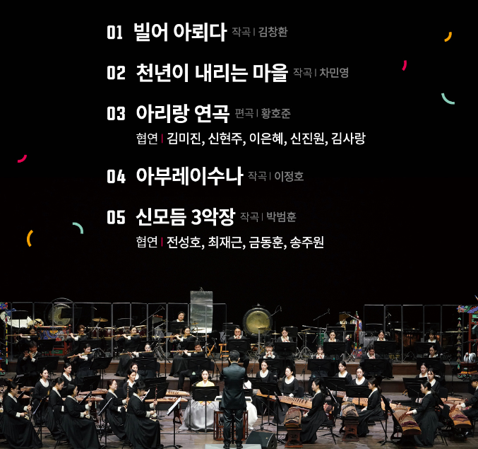 전통의 동시대성을 고민하는 다양한 예술가들이 함께하는 음악축제<樂, 듣고싶다>는10월 24일(목)국립부산국악원 기악단․성악단의 국악관현악 개막공연을 시작으로, 25일(금) 전통악기 ‘훈’을 복원·개량해 선보이는 ‘공간서리서리’, 26일(토) 민요를 아카펠라로 재구성하여 선보이는국악아카펠라그룹 ‘토리스’, 31일(목) 드라마 OST 및 국악과의 크로스오버 무대를 선보이는 ‘두번째달’, 11월 1일(금) 국내 최고의 재즈 뮤지션과 전통음악 연주자들의 환상적인 연주를 선보이는 ‘신한악’, 2일(토) 창작음악의 무한한 변신을 선보이는 ‘경기시나위오케스트라’의 폐막무대 등 국악을 기반으로 한 다양한 레퍼토리의 공연을 만나볼 수 있다.