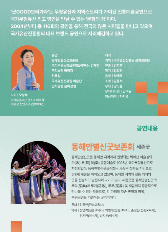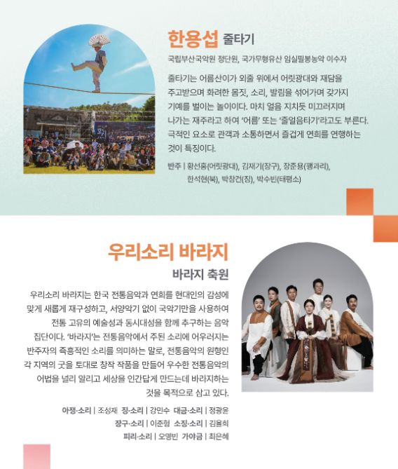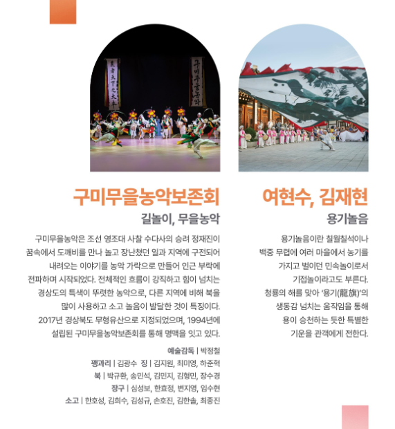 동해안별신굿보존회, 구미무을농악 보존회와 여현수, 김재현, 우리소리 바라지, 한용섭, 국가유산진흥원 예술단, 연희공방 음마깽깽과 같은 최고의 예술 명인들이 한자리에 모입니다