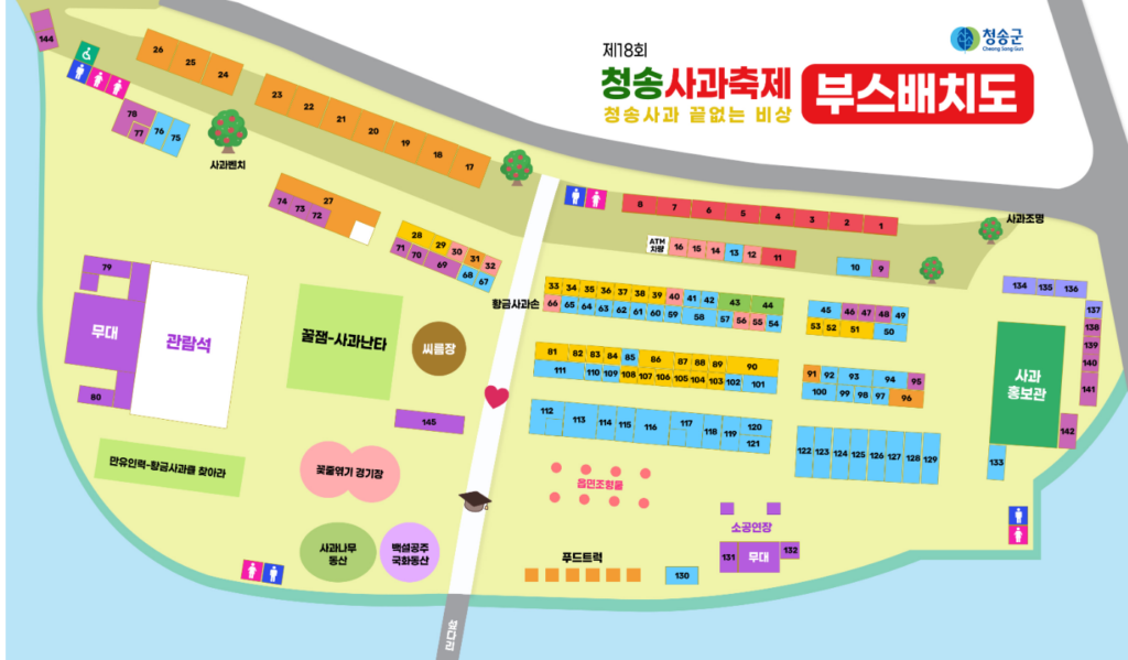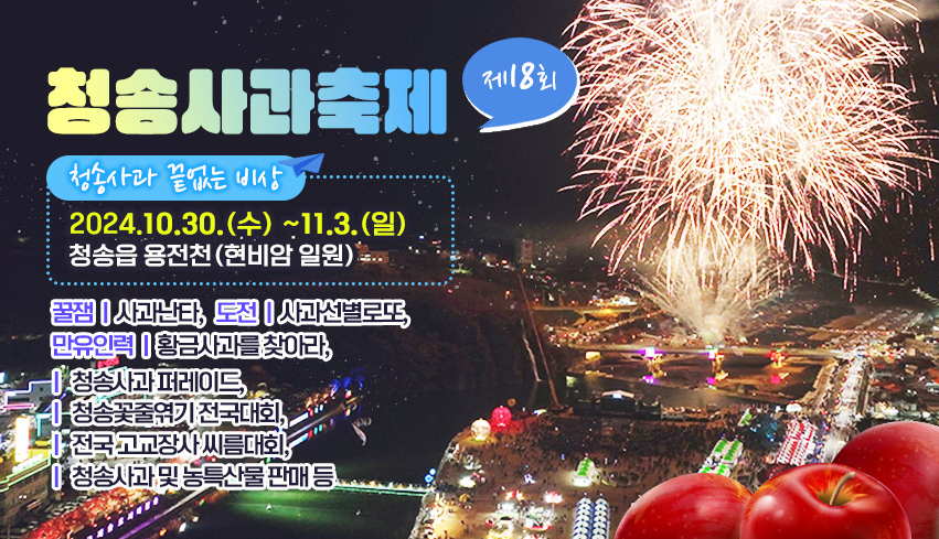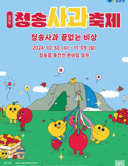 제18회 청송사과축제는 청송사과가 가장 풍성한 10월 30일(수)부터 11월 3일(일)까지 5일간 청송읍 용전천 일원에서 개최됩니다.