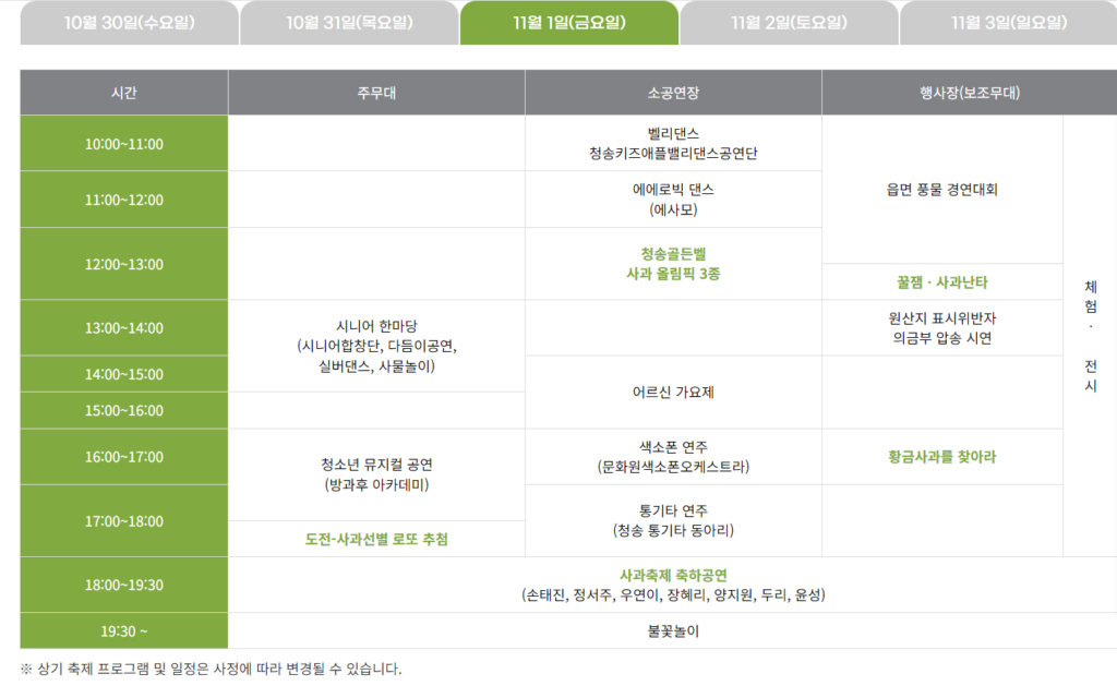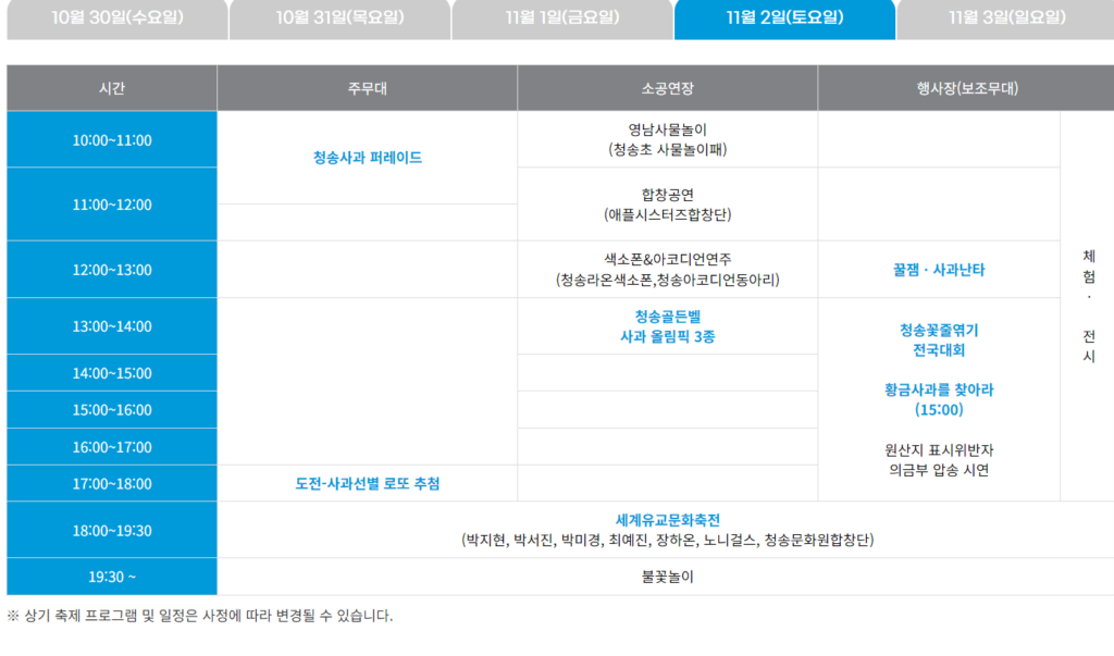 다양한 전시·판매·체험 부스를 비롯하여 청송사과 퍼레이드, 청송사과 꽃줄엮기 전국대회 등 군민과 관광객이 하나 되는 참여형 프로그램과 청송 골든벨, 사과방망이 등 다양한 체험 프로그램이 운영되며, 헬로콘서트 좋은날, 세계유교문화축전(트로트콘서트) 등 다채로운 공연도 준비되어 있다.