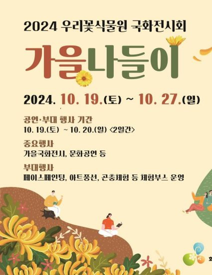 화성시(시장 정명근)는 오는 19일부터 27일까지 9일간 우리꽃식물원에서 ‘가을 나들이’를 주제로 가을을 만끽하고 향유할 수 있는 가을 국화전시회를 개최한다.