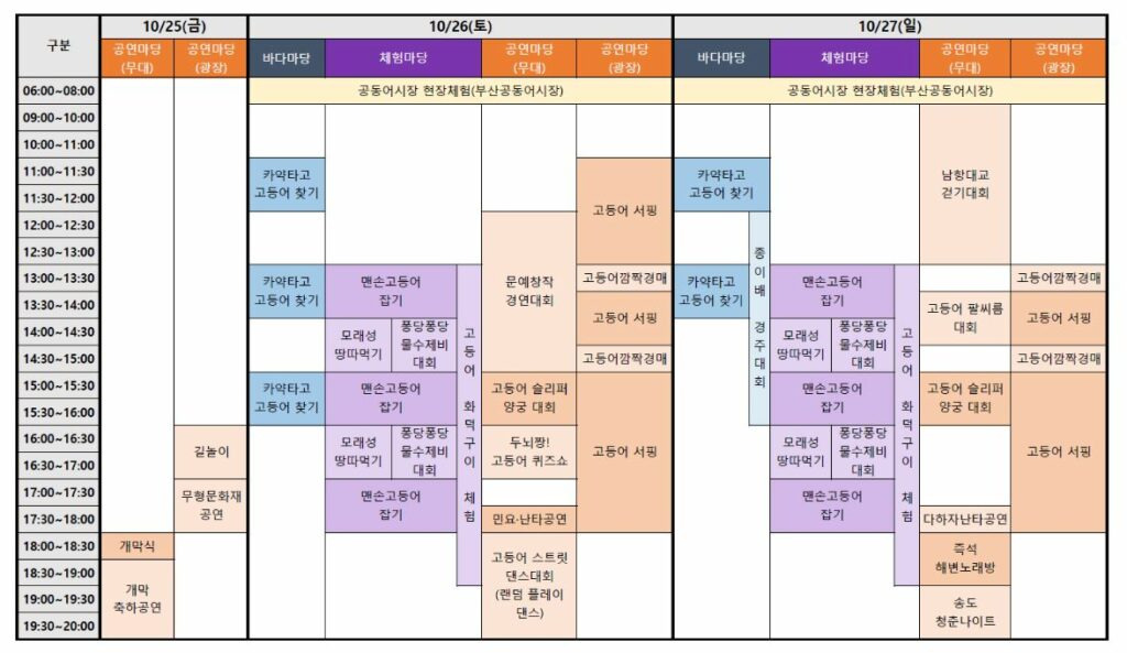 모래성 땅따먹기, 퐁당퐁당 물수제비 대회, 고등어 슬리퍼 양궁 대회, 고등어 퀴즈쇼, 고등어 서핑, 고등어 먹거리 장터, 수산물 직거래 장터, 누리마켓, 플리마켓, 키즈놀이마당, 남항대교 걷기대회 등 프로그램이 준비되어 있습니다.