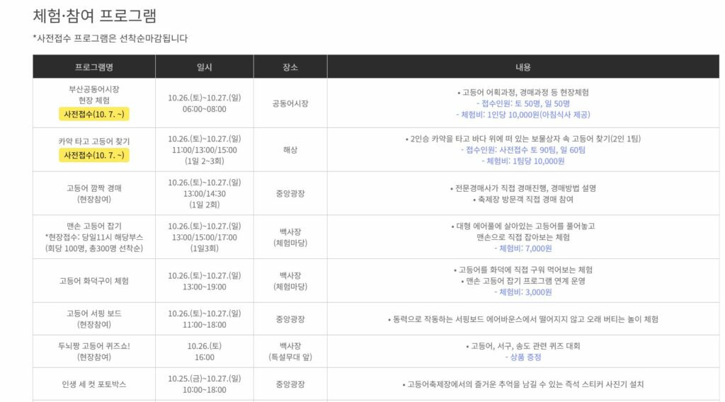 부산공동어시장 현장체험, 맨손 고등어 잡기, 고등어 깜짝 경매를 비롯한 카약타고 고등어 찾기, 고등어 요리왕을 찾아라, 고등어맨 종이배 경주대회, 수산기업홍보관, 고등어 먹거리장터 등 독특하고 참신한 체험·투어·전시·경연·공연 프로그램을 운영합니다.