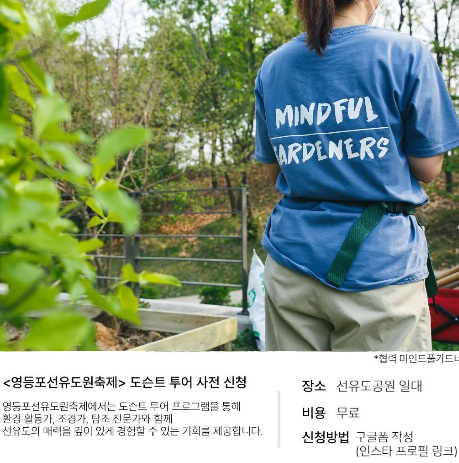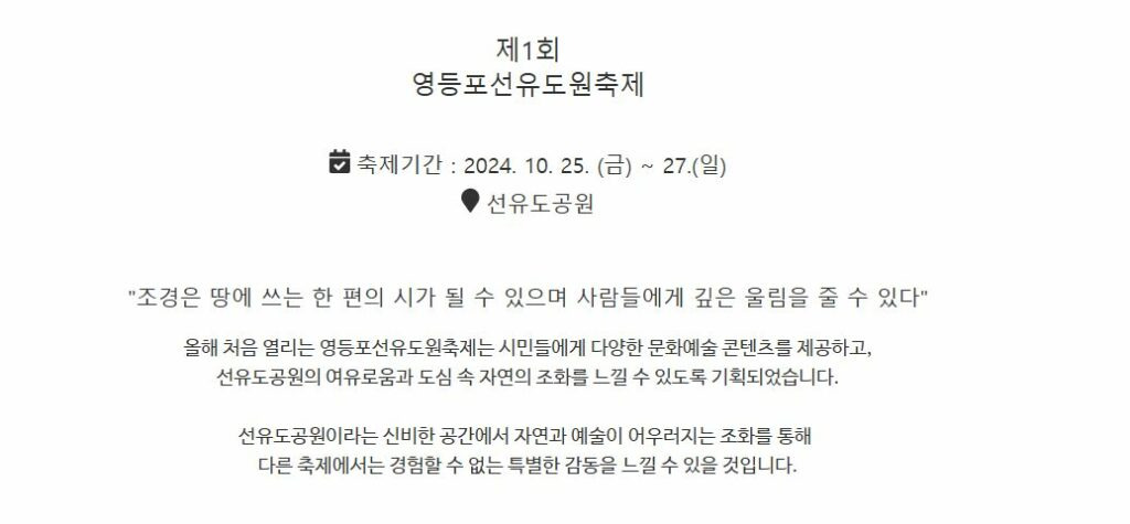 세계적으로 인정받는 제프리 젤리코상 수사자인 조경가 정영선이 설계한 최초의 친환경 공원 영등포 선유도원 축제가 2024년 10월 25일부터 27일까지 영등포 선유도공원 일원에서 개최합니다.
