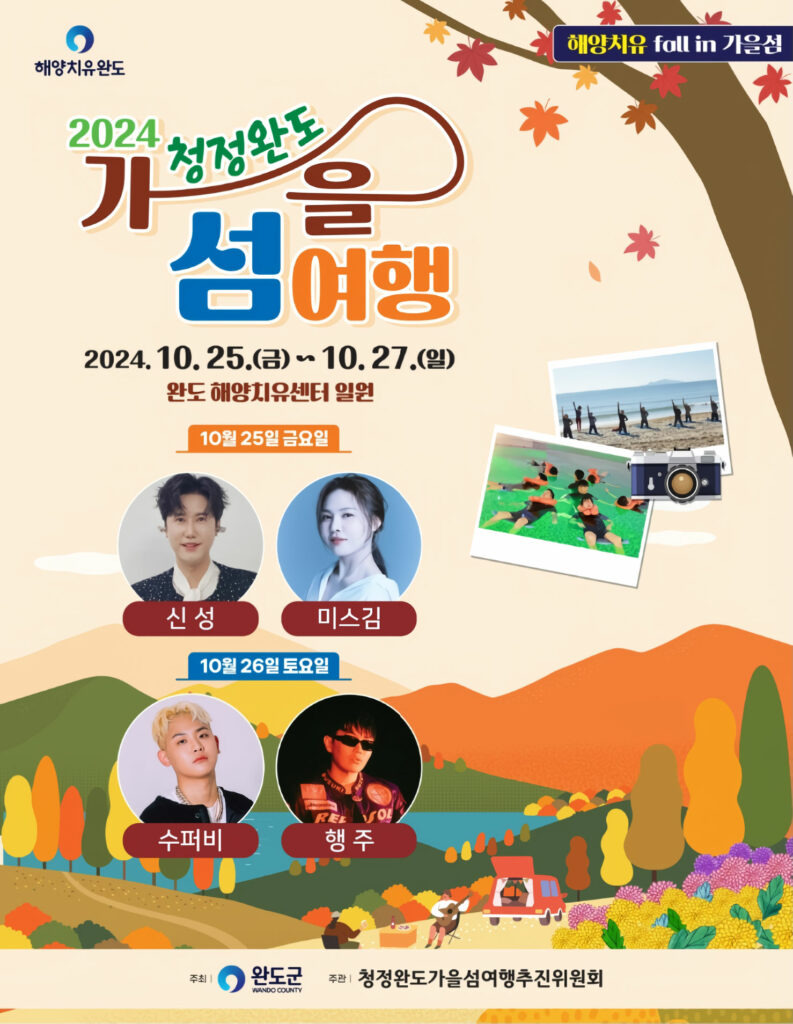 완도군의 다양한 해양자원을 활용한 해양치유산업을 홍보하고 완도 가을 체류형 관광객을 유치하기 위해 ‘해양치유 fall in 가을섬’이라는 주제로 진행되는 청정완도 가을섬 여행이 2024년 10월 25일부터 27일까지 개최합니다.