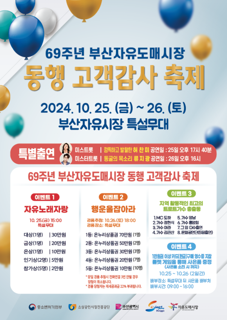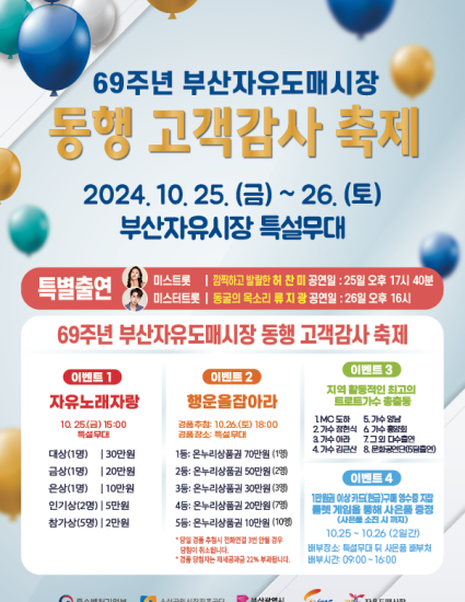 배원열 번영회장은 “오랫동안 고객들과 함께해온 부산자유시장이 앞으로도 시대의 변화에 맞춰 더 많은 고객들이 찾는 시장으로 거듭나기 위해 노력하고 있다”며 “이번 행사가 안전하고 즐거운 축제의 장이 되고, 많은 분들이 오셔서 각종 공연과 푸짐한 경품 행사의 행운도 가져가시길 바란다”고 전했다.