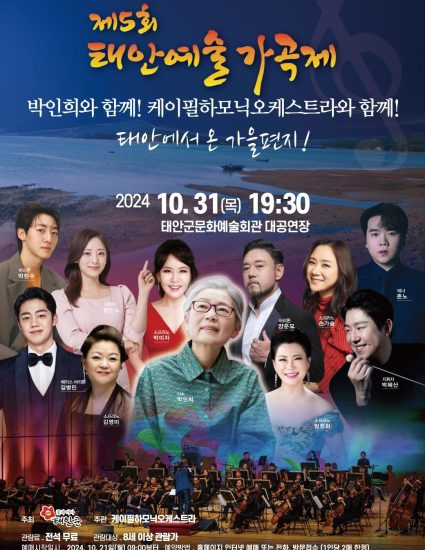 태안군은 오는 10월 31일(목) 오후 7시 30분 태안군문화예술회관 대공연장에서 ‘제5회 태안예술가곡제’를 개최키로 하고 21일 오전 9시부터 예매에 돌입한다고 밝혔다.