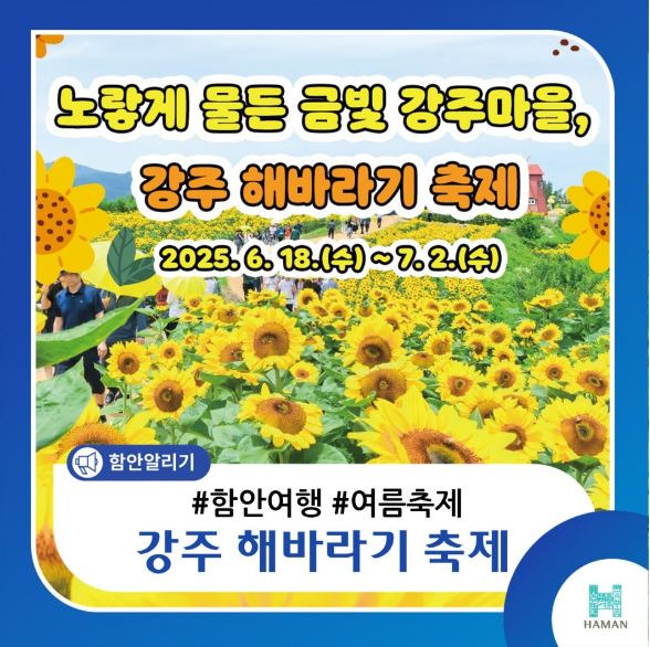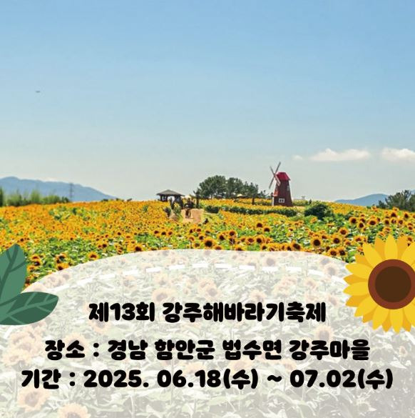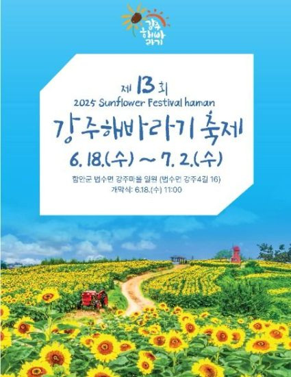 아름다운 해바라기 꽃과 해바라기 관련 다양한 행사가 개최되는 제13회 강주해바라기 축제가 2025년 6월 18일부터 7월 14일까지 개최됩니다.