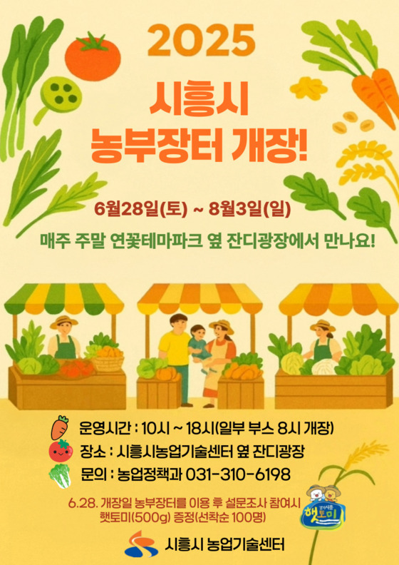 시흥시(시장 임병택)가 지역농산물 소비 촉진과 농가 판로 확대를 위해 오는 6월 28일부터 8월 3일까지 ‘농부장터’를 연꽃테마파크 잔디광장에서 개장한다. 농부장터는 매주 토요일과 일요일 오전 10시부터 오후 6시까지 총 12회에 걸쳐 운영된다.