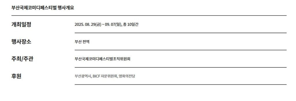 국내·외 코미디언들이 선보이는 공연과 다양하고 재미있는 프로그램이 펼쳐지는 부산국제코미디페스티벌이 2025년 8월 29일부터 9월 7일까지 개최합니다.