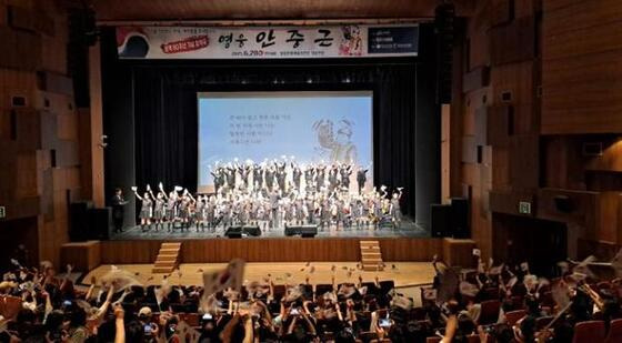 역사를 기억하는 무대 “영웅 안중근”은 (사)누림이 운영하는 영광군꿈키움오케스트라(감독 김수연) 단원들과 영광여성합창단(단장 김성운), 영광청음중창단(대표 김정선), 영광중앙초글로리합창단(담당교사 유수영)이 함께 만들어낸 아름다운 악기와 목소리의 하모니로, 관객들의 마음을 하나로 잇는 뜻깊은 시간이 됐다.