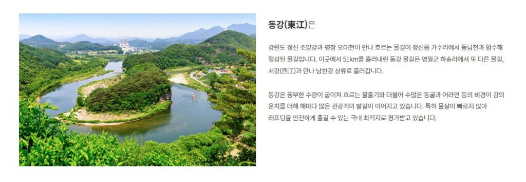 동강은 풍부한 수량이 굽이쳐 흐르는 물줄기와 더불어 수많은 동굴과 어라연 등의 비경이 강의 운치를 더해 해마다 많은 관광객의 발길이 이어지고 있습니다. 특히 물살이 빠르지 않아 래프팅을 안전하게 즐길 수 있는 국내 최적지로 평가받고 있습니다.