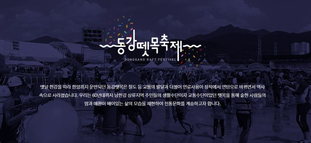 우리는 60년대까지 남한강 상류지역 주민들의 생활수단이자 교통수단이었던 뗏목을 통해 숱한 사람들의 땀과 애환이 배어있는 삶의 모습을 재현하여 전통문화를 계승하고자 합니다.
