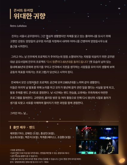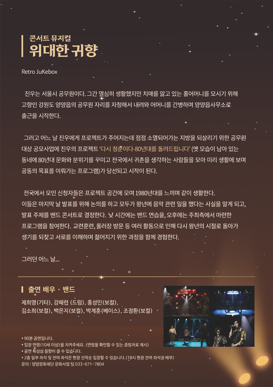 (재)양양문화재단에서는 7월 16일(수) 오후 7시,양양군문화복지회관 공연장에서 “콘서트 뮤지컬 – 위대한 귀향”공연을 개최한다.