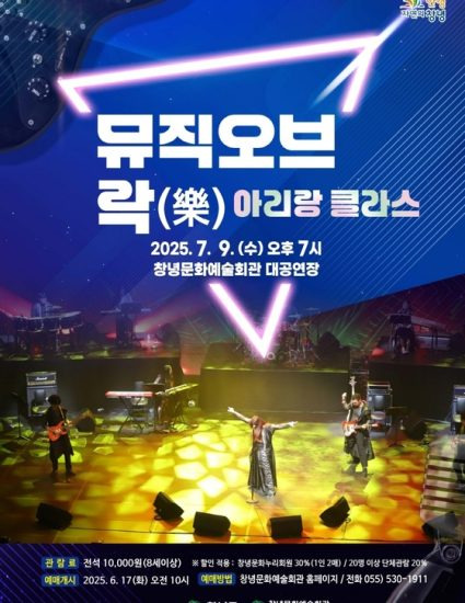 창녕군(군수 성낙인)은 7월 9일(화) 오후 7시, 창녕문화예술회관 대공연장에서 퓨전국악 공연 ‘뮤직 오브 樂, 아리랑 클라스’를 개최한다고 밝혔다.
