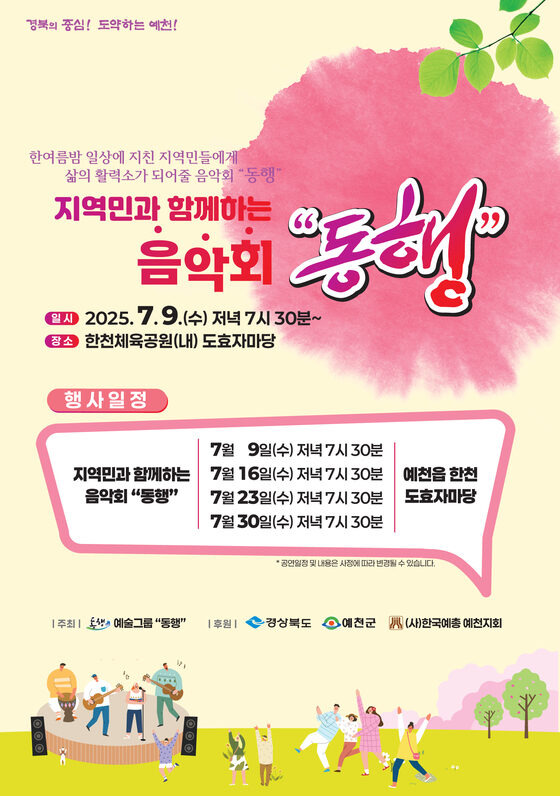 예술그룹 동행(대표 권예성)이 주최하고 예천군(군수 김학동)이 후원하는 지역민과 함께하는 음악회 ‘동행’이 이달 9일부터 30일까지 매주 수요일 오후 7시 30분 예천읍 한천 도효자마당에서 개최된다.