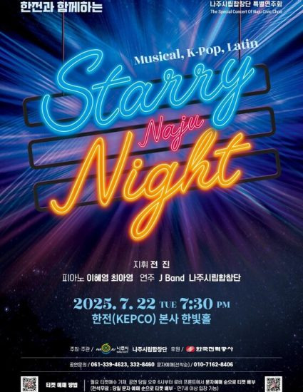 나주시립합창단은 그간 정기연주회와 기획공연을 통해 높은 음악성과 감동적인 무대를 선보이며 지역 문화예술 발전에 기여해 왔다. 이번 ‘Starry Night’ 공연은 기존의 엄숙한 합창 무대에서 벗어나 보다 경쾌하고 감성적인 분위기 속에서 시민과 교감하는 열린 무대로 기획되었다.