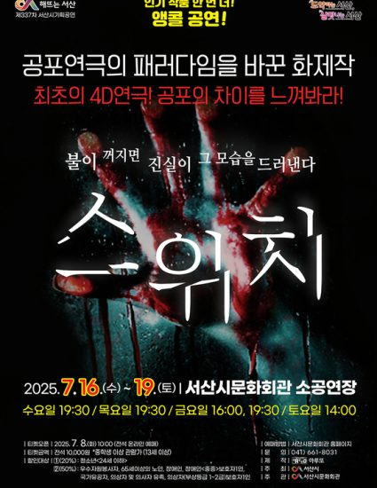 대학로 스테디셀러인 ‘스위치’는 지난 2023년 서산시 개최 당시 티켓 예매 시작 3분 만에 매진을 기록한 인기 작품이다.