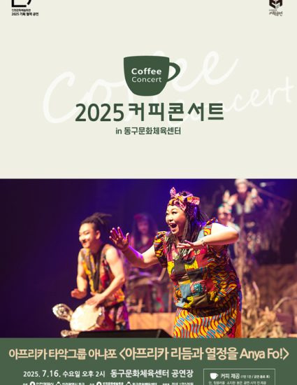 인천 동구문화체육센터(구청장 김찬진)는 오는 16일 오후 2시 커피콘서트의 마지막 무대를 선보인다고 밝혔다. 이번 무대는 아프리카 타악그룹 ‘아냐포(Anya Fo)’가 출연해, 관객과 어우러지는 신명 나는 공연이 펼쳐질 예정이다.