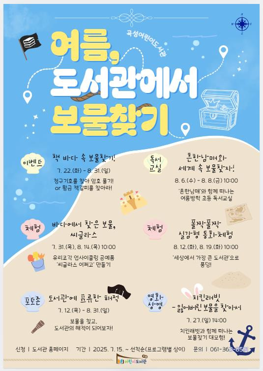 곡성군(군수 조상래)은 여름방학 기간인 오는 7월 22일부터 8월 31일까지 ‘여름, 도서관에서 보물찾기”라는 주제로 곡성어린이도서관에서 지역민을 위한 다양한 독서문화 행사를 운영한다고 14일 전했다.