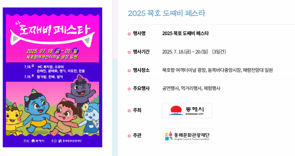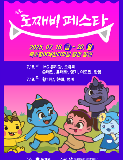강원도 대표 먹거리 및 체험형 여름 축제인 묵호 도째비페스타가 2025년 7월 18일부터 20일까지 묵호항 여객터미널 광장과 해랑전망대 일원에서 개최합니다.