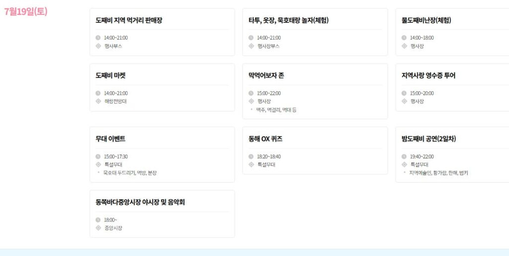 기타 : 도째비 불꽃놀이(18일), 도째비를 찾아라(보물찾기), 동해사랑 영수증 투어, 동쪽바다중앙시장 야시장 한마당(야시장 먹거리, 지역 가수 공연), 마술체험 등