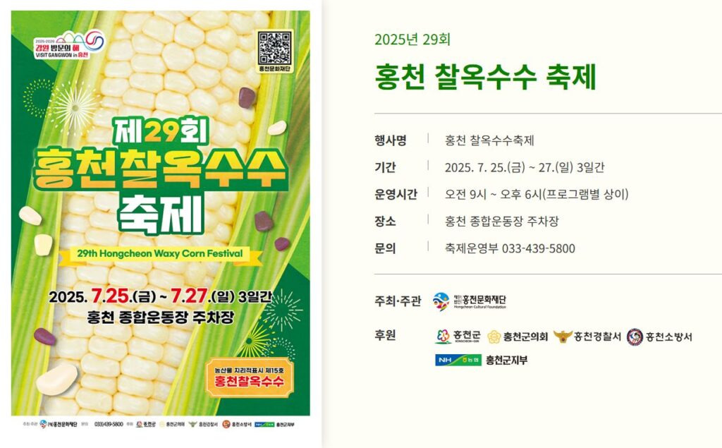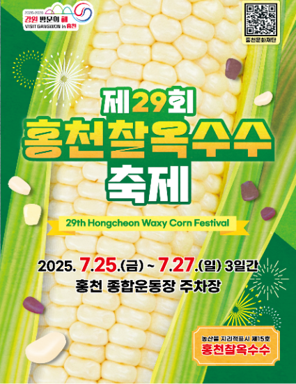 다른 고장과 차별화된 찰지고 쫄깃한 홍천찰옥수수축제가 2025년 7월 25일부터 27일까지 홍천종합운동장 주차장 일원에서 개최한다.