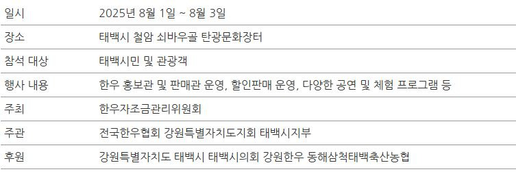 주최/주관 : 쇠바우골 탄광문화 고기축제 위원회, 한우자조금관리위원회, 전국한우협회