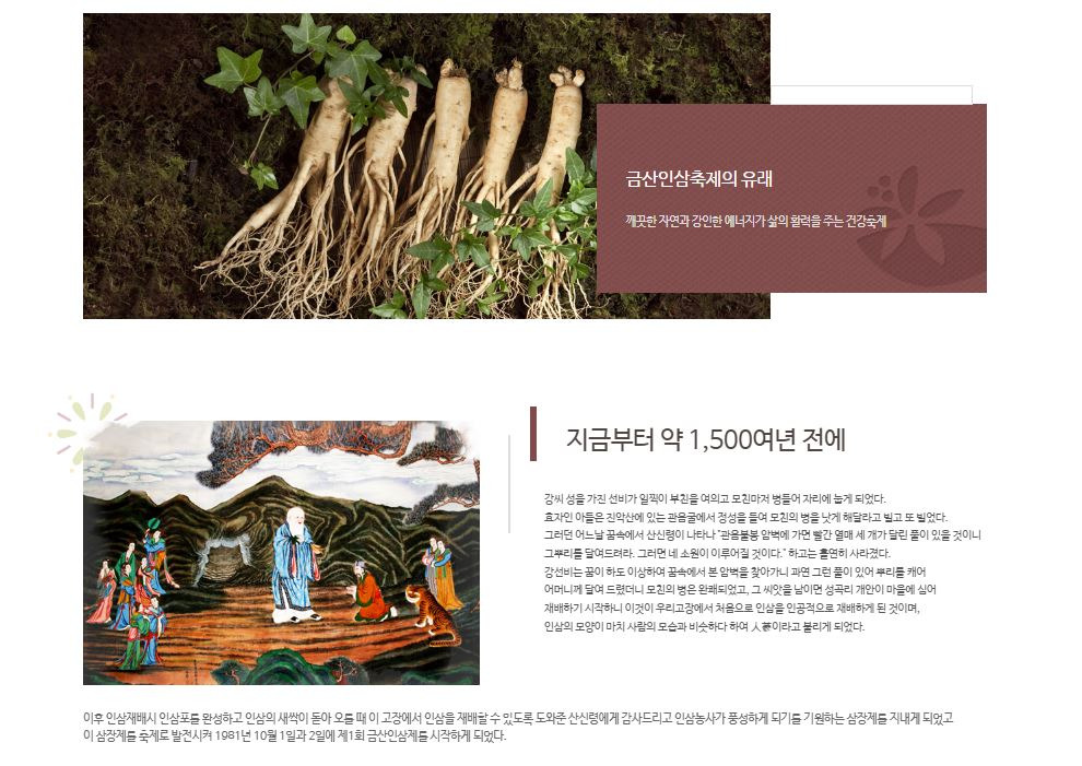 문화체육관광부가 선정하는 전국 최우수축제 10회 선정 되는 등 명예 문화관광축제로 지정되어 있는 금산세계인삼축제입니다.