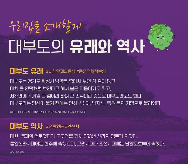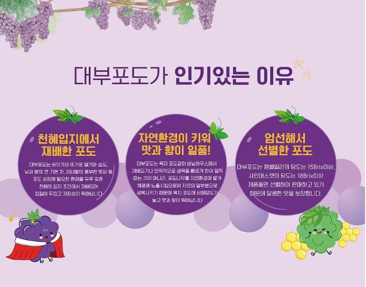 대부포도는 해풍을 맞고 자라 풍미가 좋고 당도가 높은게 특징입니다.