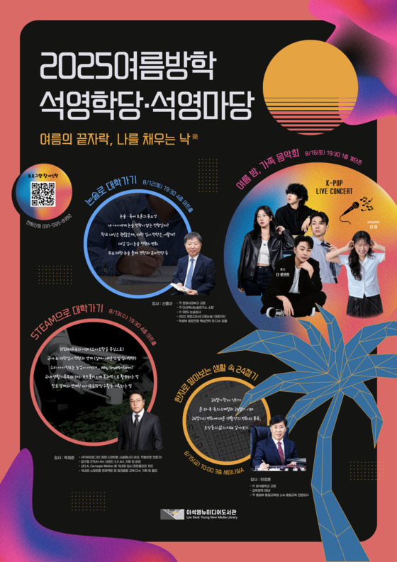 도서관은 여름방학을 맞아 가족 음악회 외에도 △논술로 대학가기 △STEAM으로 대학가기 △한자로 알아보는 생활 속 24절기 등 청소년과 학부모 대상 특강을 마련해 다양한 배움과 즐길 거리를 제공한다. 자세한 내용은 이석영뉴미디어도서관 누리집에서 확인할 수 있다.