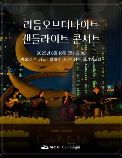 여수시(시장 정기명)는 오는 8월 16일(토) 오후 7시, 예술의 섬 장도 야외공연장에서 ‘리듬오브더나이트, 여수(Rhythm of the Night, Yeosu)’ 캔들라이트 콘서트를 개최한다고 밝혔다.