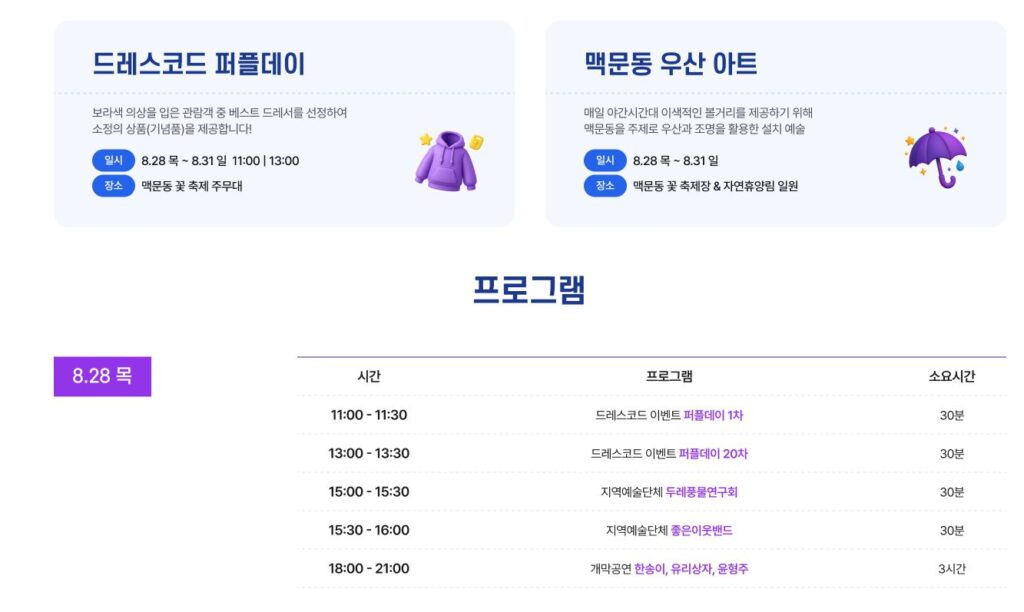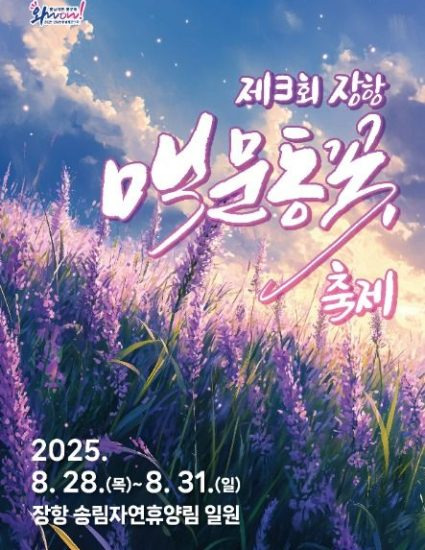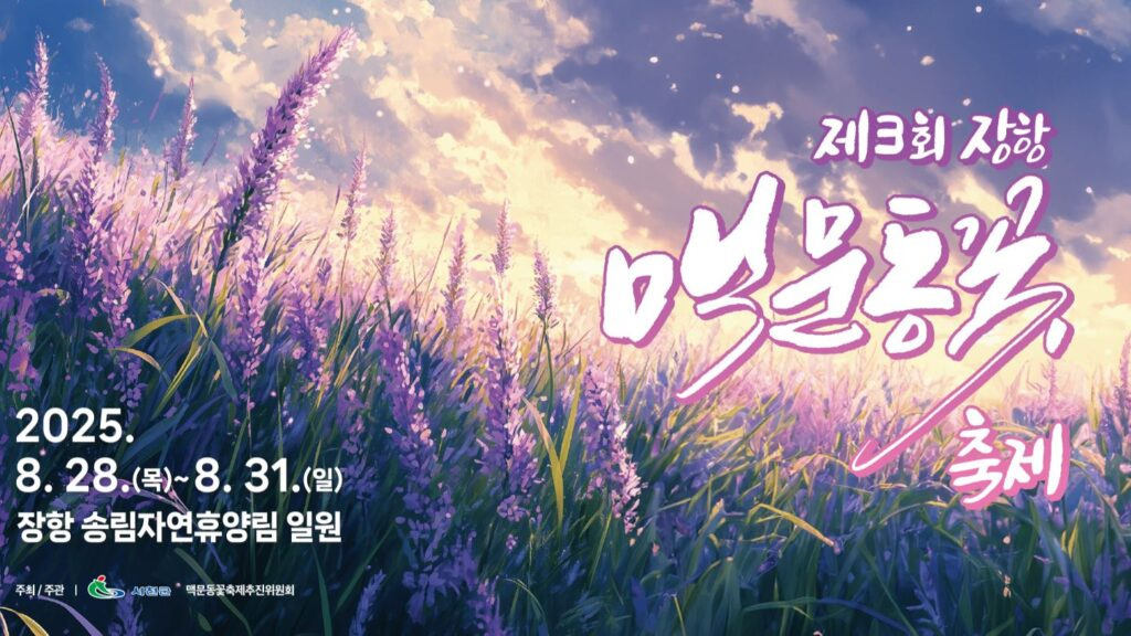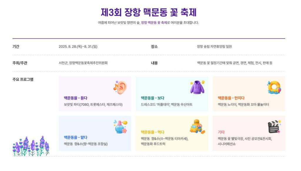 맥문동꽃이 어우러져 자연에 대한 경이로움을 만끽하며 풍부한 먹거리를 즐길 수 장항 맥문동 꽃 축제가 2025년 8월 28일부터 31일까지 장항 송림산림욕장 일원에서 개최합니다.