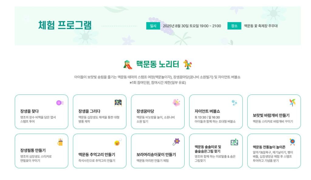 감성 포토존, 플리마켓, 체험 프로그램, 문화공연 등 다양한 콘텐츠가 운영되어 남녀노소 누구나 즐길 수 있는 축제로 자리매김하고 있습니다.