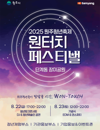 원주시는 오는 22일(금) 오후 5시부터 23일(토)까지 2일간 단계동 장미공원에서 2025 원주청년축제 ‘원터치페스티벌’을 개최한다.