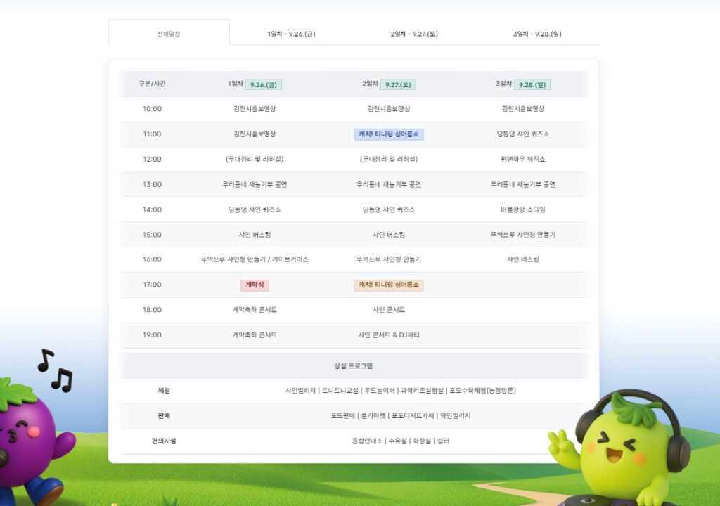 포도 수확 체험, 샤인머스켓 시싱행사, 가족이 함께 즐길 수 있는 공연과 전시, 어린이 체험 프로그램 등 다양한 콘텐츠로 구성되어 있습니다.