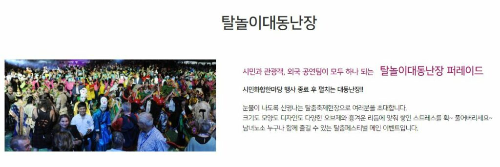 또한 다양한 퍼포먼스를 통해 서로가 소통할 수 있는 화합과 대동의 장을 만들어 세계인을 하나로 만들고자 하며 탈을 쓰면 그 속에서 누구나 자유롭고 평등한 세상을 구현할 수 있고, 비일상의 시공간을 통해 새로운 자신을 만날 수 있었습니다.