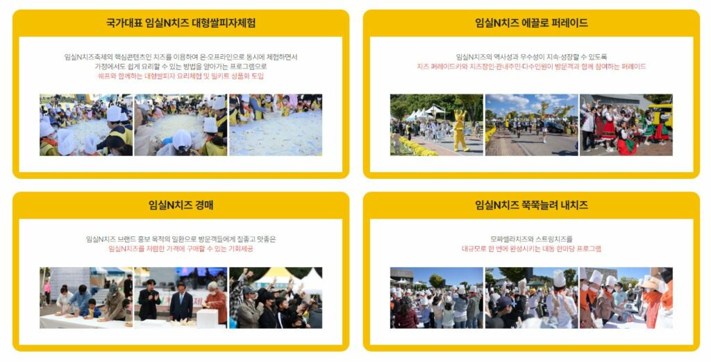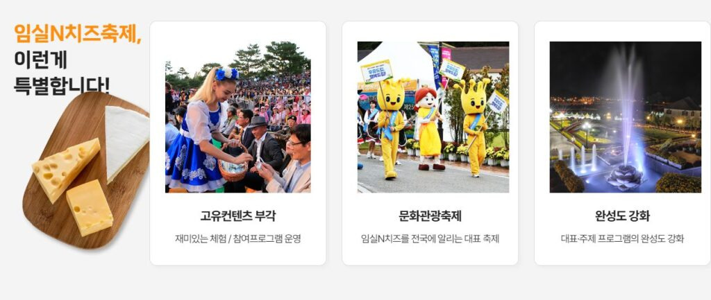 임실N치즈축제는 고유콘텐츠를 부각하고, 완성도를 강화하여 전국에 알리는 대표적인 문화관광축제로 계속 발전하고 있습니다.