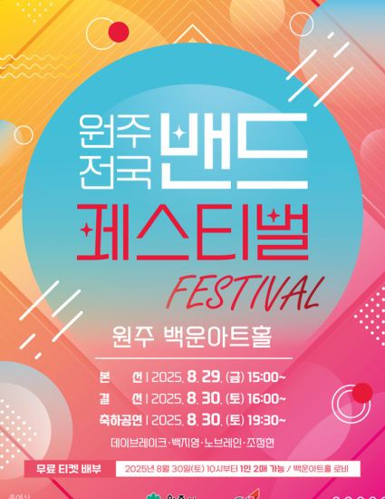 원주시는 8월 29일부터 30일까지 2일간 백운아트홀에서 ‘2025 원주 전국 밴드 페스티벌’을 개최한다.