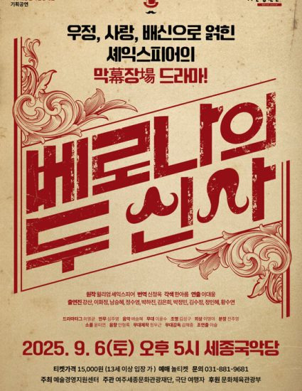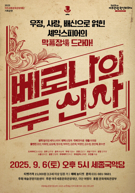 여주세종문화관광재단이 오는 9월 6일(토), 예술경영지원센터의 공모사업인 <공연예술 지역 유통지원 사업>에 선정되어 연극‘베로나의 두 신사’를 세종국악당에서 개최한다.