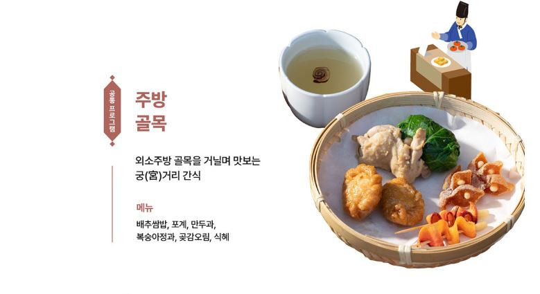 ‘수라간 시식공감’은 궁중 문화를 보고 먹고 즐기고 감동한다는 視 시각, 食 음식, 公 공연, 感 감동을 주제로 궁중음식문화를 직접 체험해 보는 전통문화 복합체험 프로그램입니다.