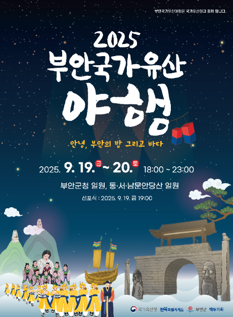 지역의 특색있는 역사문화자원을 활용한 야간문화 향유 프로그램인 부안국가유산야행이 2025년 9월 19일부터 20일까지 부안군청 일원에서 개최합니다.