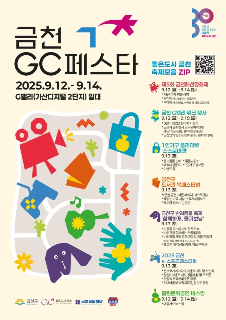 9월 12일부터 14일까지 개최되는 GC페스타에서는 제5회 금천패션영화제, 1인가구 플리마켓, G밸리위크 행사, 반려동물의 날 기념축제, 북페스티벌, e-스포츠 페스티벌, 열린문화 버스킹 등 다채로운 축제가 개최합니다.