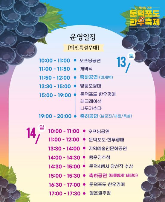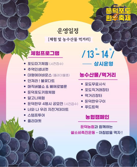 포도농가체험, 대형에어바운스 놀이장, 스탬프투어, 먹거리부스, 둔덕포도&한우 할인 마켓, 가수 초청공연 등이 준비되어 있습니다.