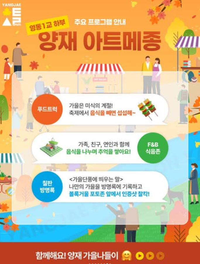 양재천길 수변무대에서 펼쳐지는 다채로운 장르의 버스킹 공연과 특별공연, 양재천길을 거닐며 만나보는 개성 넘치는 수공예품 플리마켓, 잔디광장의 해치와 함께하는 다양한 아트 체험, 영동1교 하부에서는 맛있는 푸드트럭까지 만날 수 있습니다.