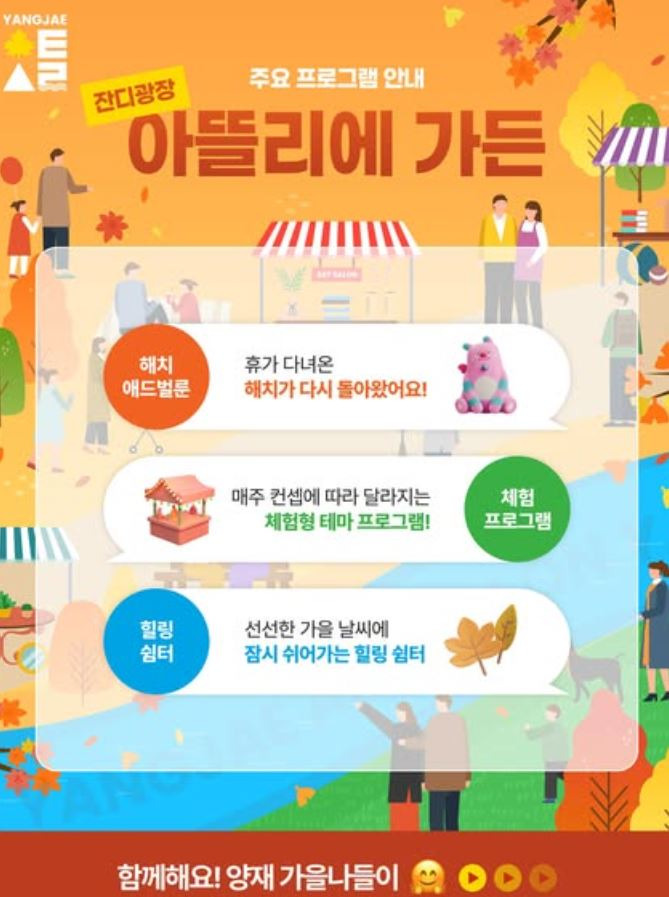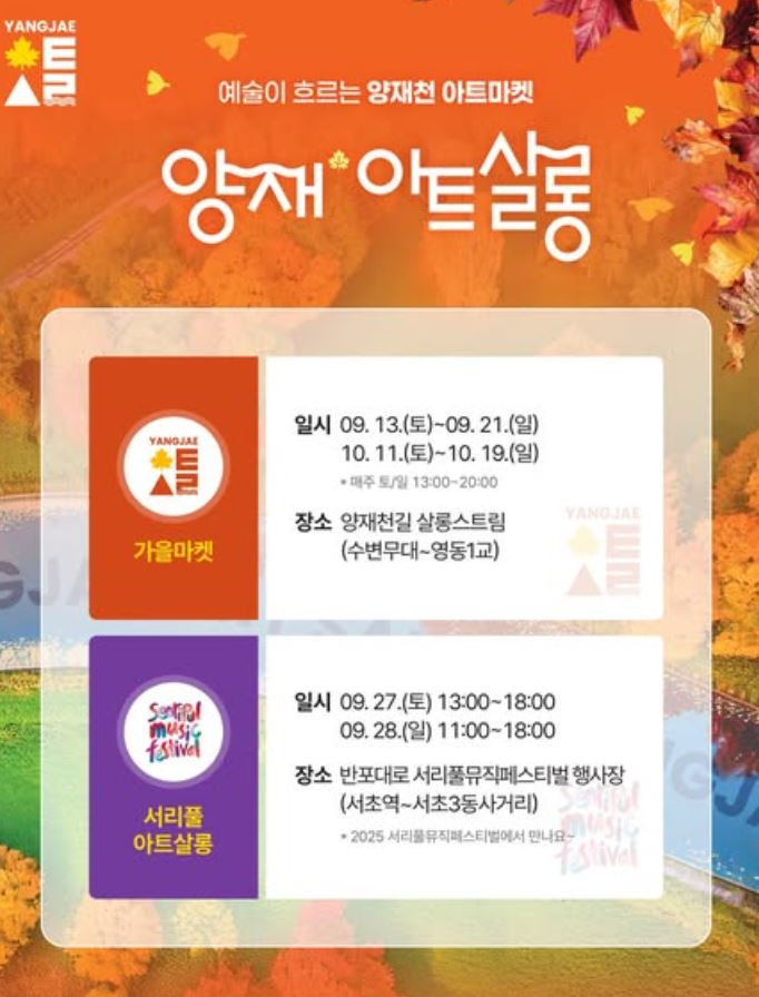 2025년 9월 13일 토요일부터 10월 19일 일요일까지 선선한 바람 따라 예술이 물드는 양재천에서 가을의 낭만을 즐길 수 있습니다.